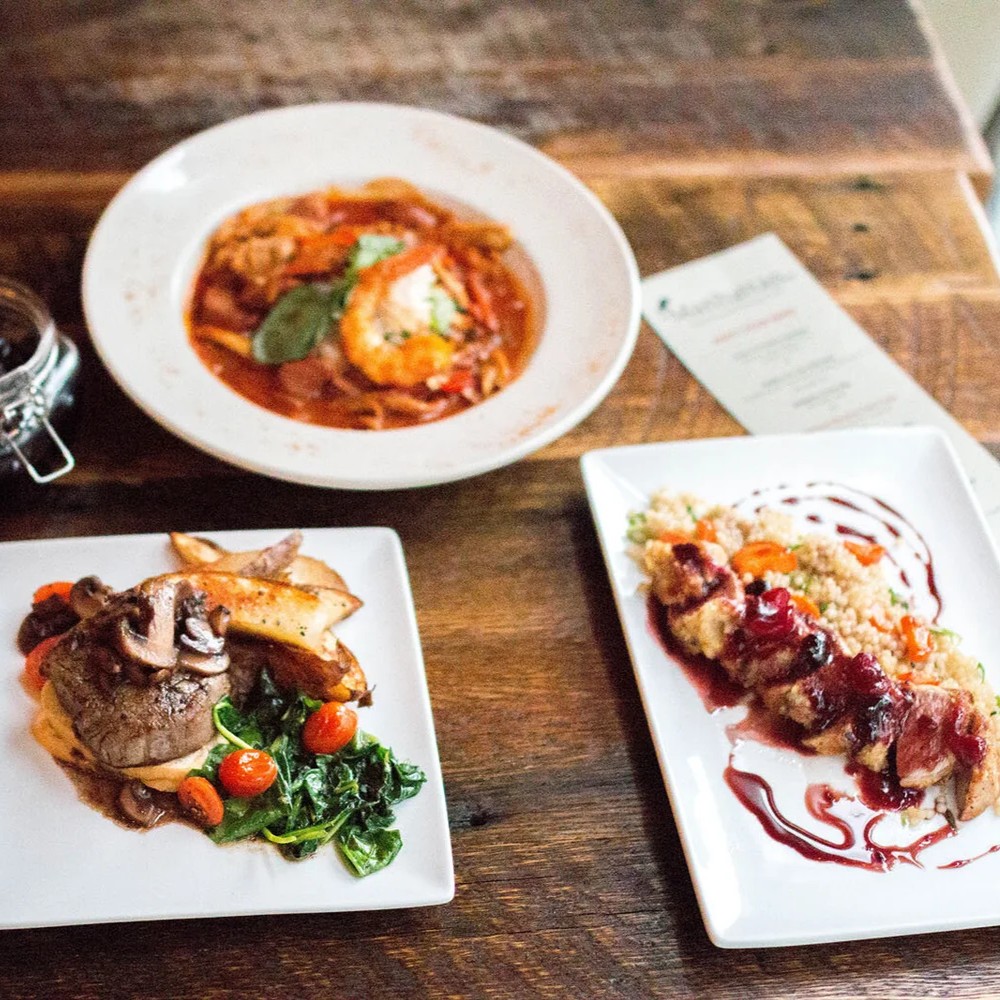 From hand-cut steaks and whiskey-glazed salmon to inventive dishes like poulet balsamique and pork tenderloin with house bacon jam, each plate highlights bold flavors and thoughtful pairings.